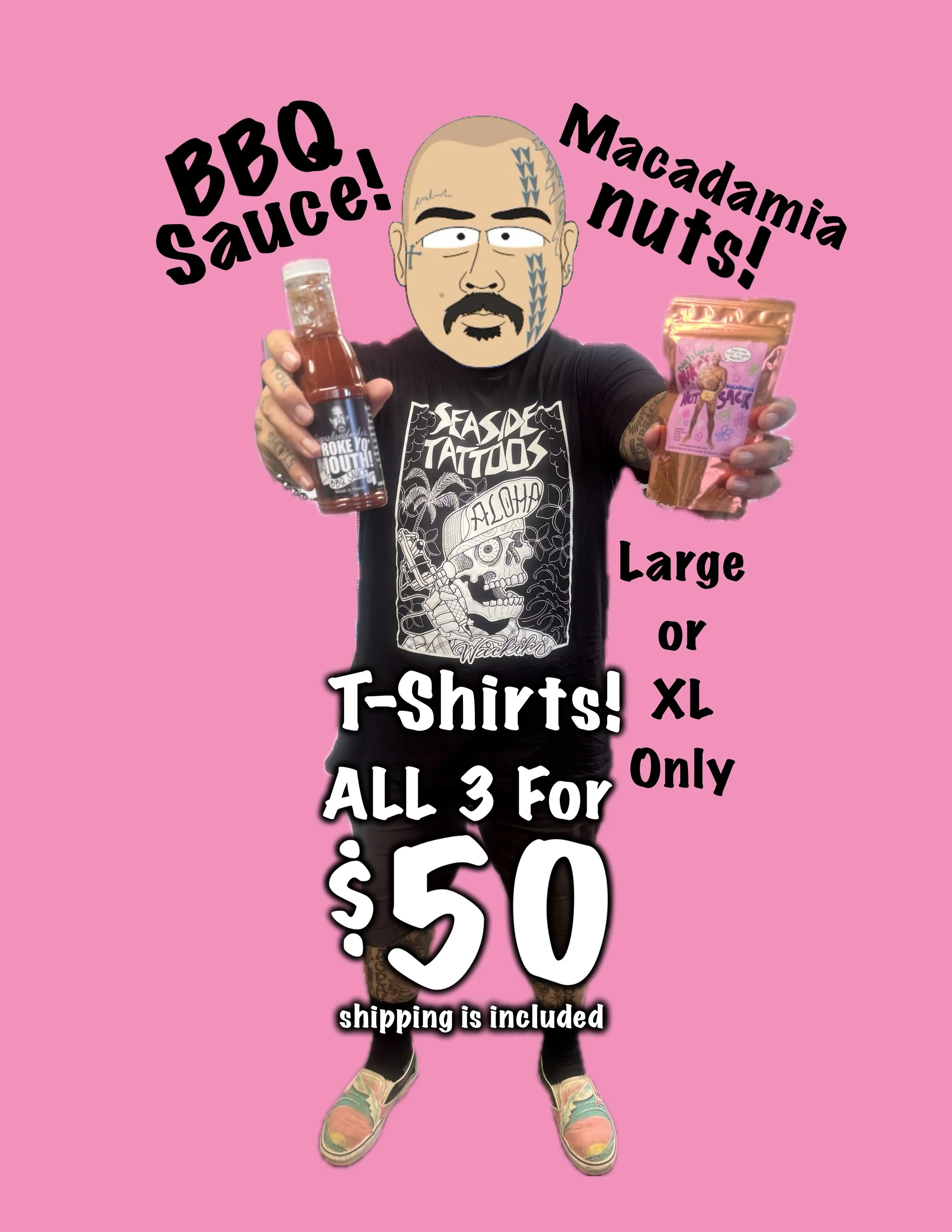Welcome to Big Island Mike’s store. We’ve got macadamia nuts, BBQ sauce, coffee, and t-shirts up for sale. Everything is locally grown or made here in Hawaii. Want to get tattooed by Big Island Mike? Go to the Contacts page and email him for an appointment. Want to know more about Big Island Mike, check out the About page. Mahalo for your support.